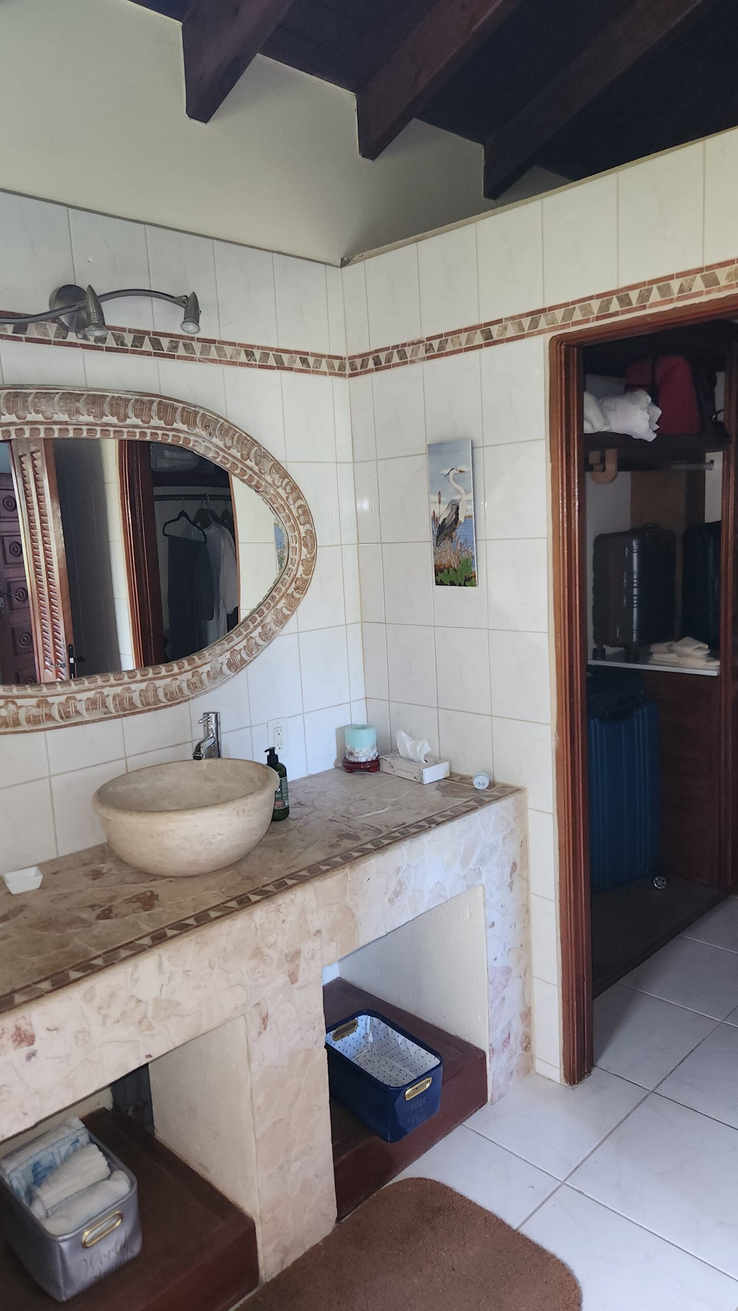 The villa offers two tranquil bedrooms, one with a king bed and one with a queen. Inside, you’ll find 1.5 bathrooms, while an additional two-piece bath on the terrace adds extra convenience for poolside living. With ground-level access to all main areas, the home is designed for effortless comfort.